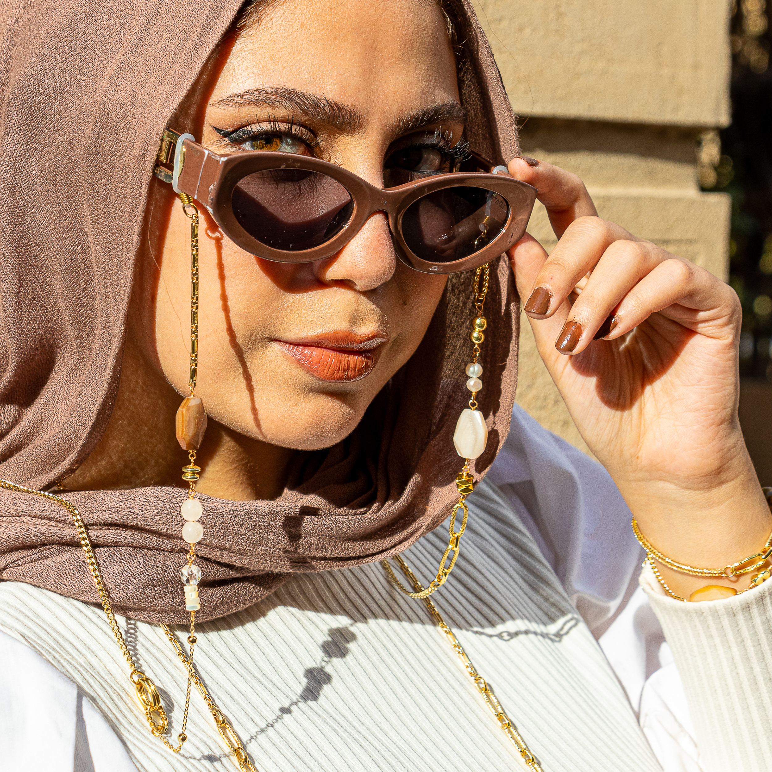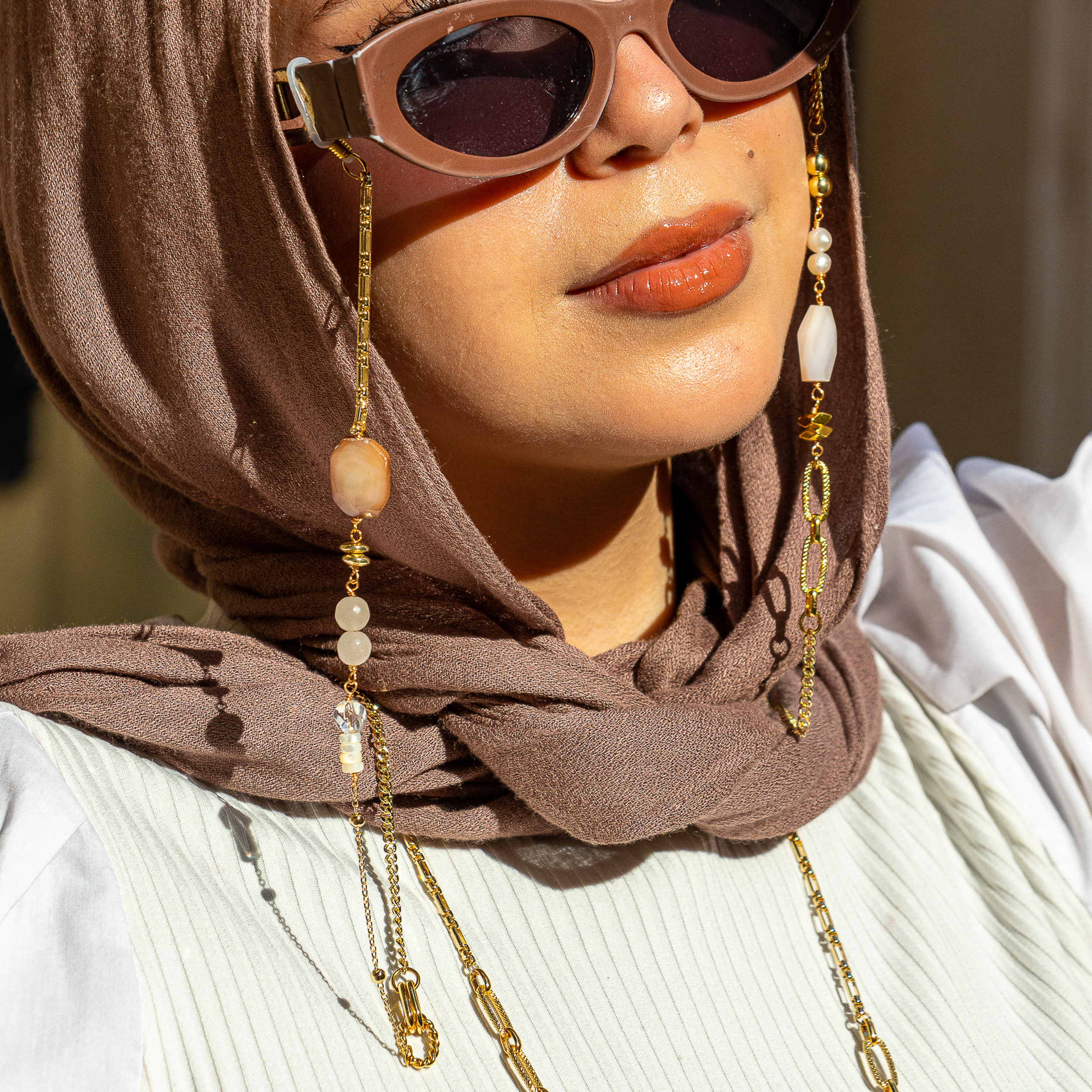 Sunglasses Cord made with goldplated chains (non tarnish), natural shell stones and gemstones.