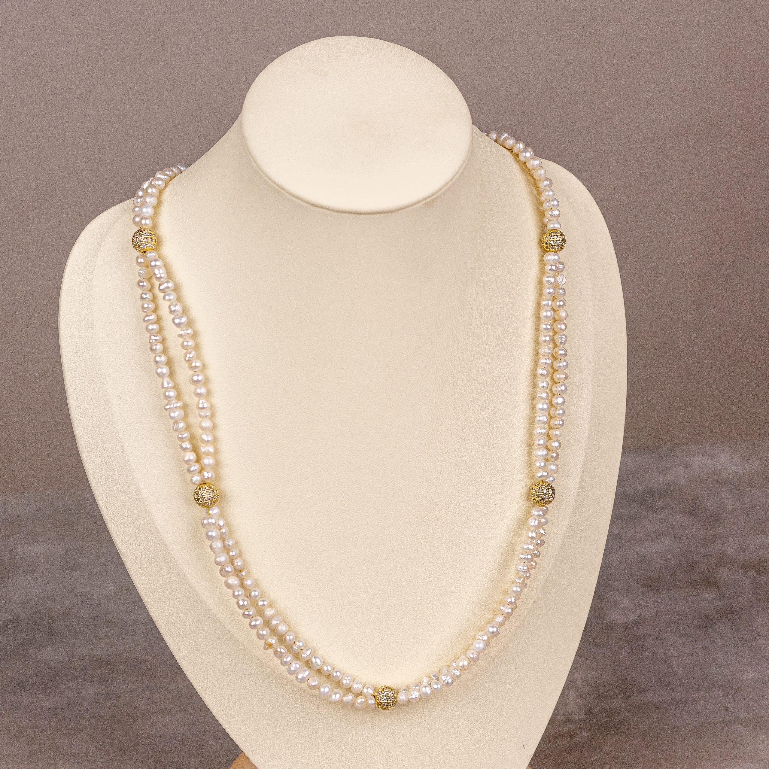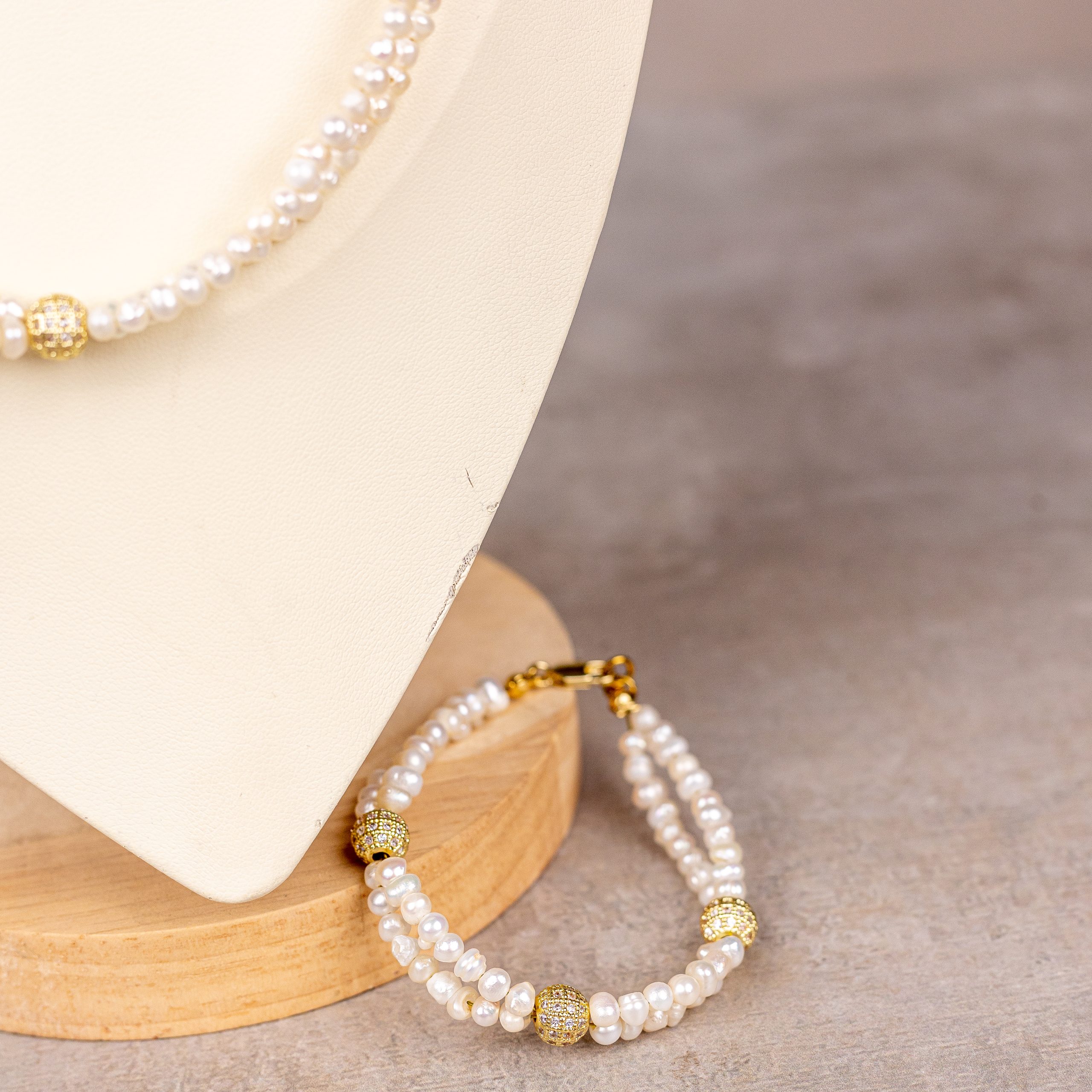 Pearl Set Necklace and bracelet, made of natural pearl stones and gold plated zircon spacer.